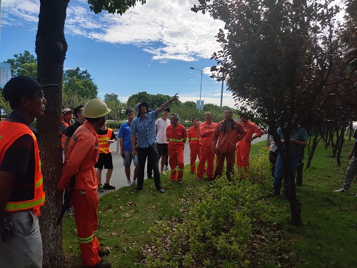 各施工隊先後(hòu)修剪了紅葉李和夾竹桃,養護施工隊負責人現場觀摩後(hòu)結合自身的養護工作提了一些修剪問題,專家逐一進(jìn)行解答。